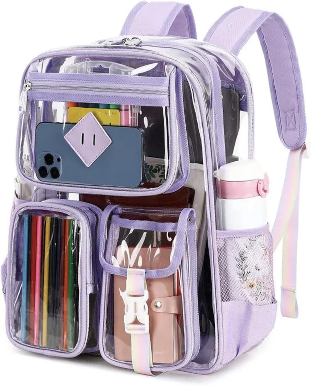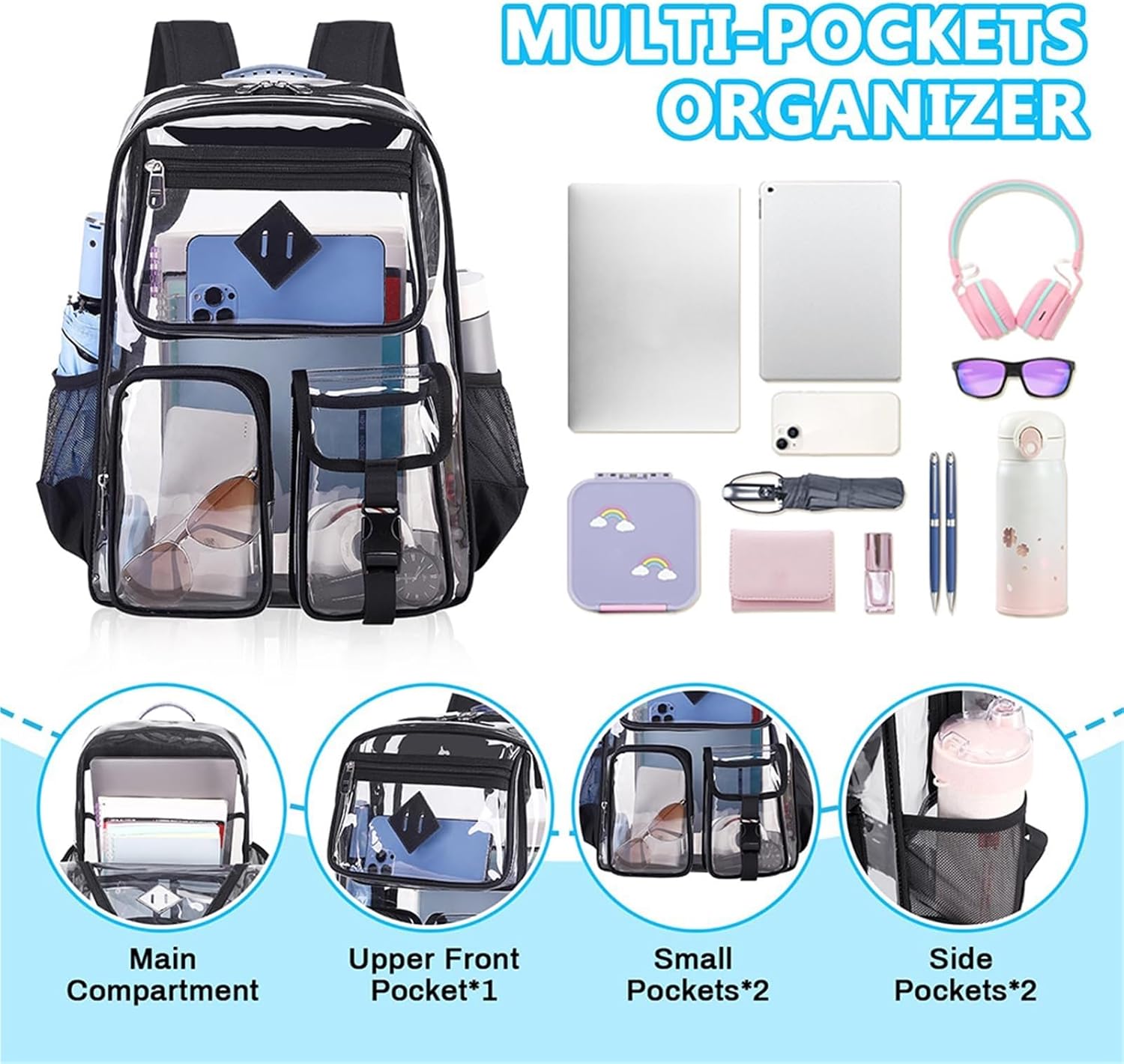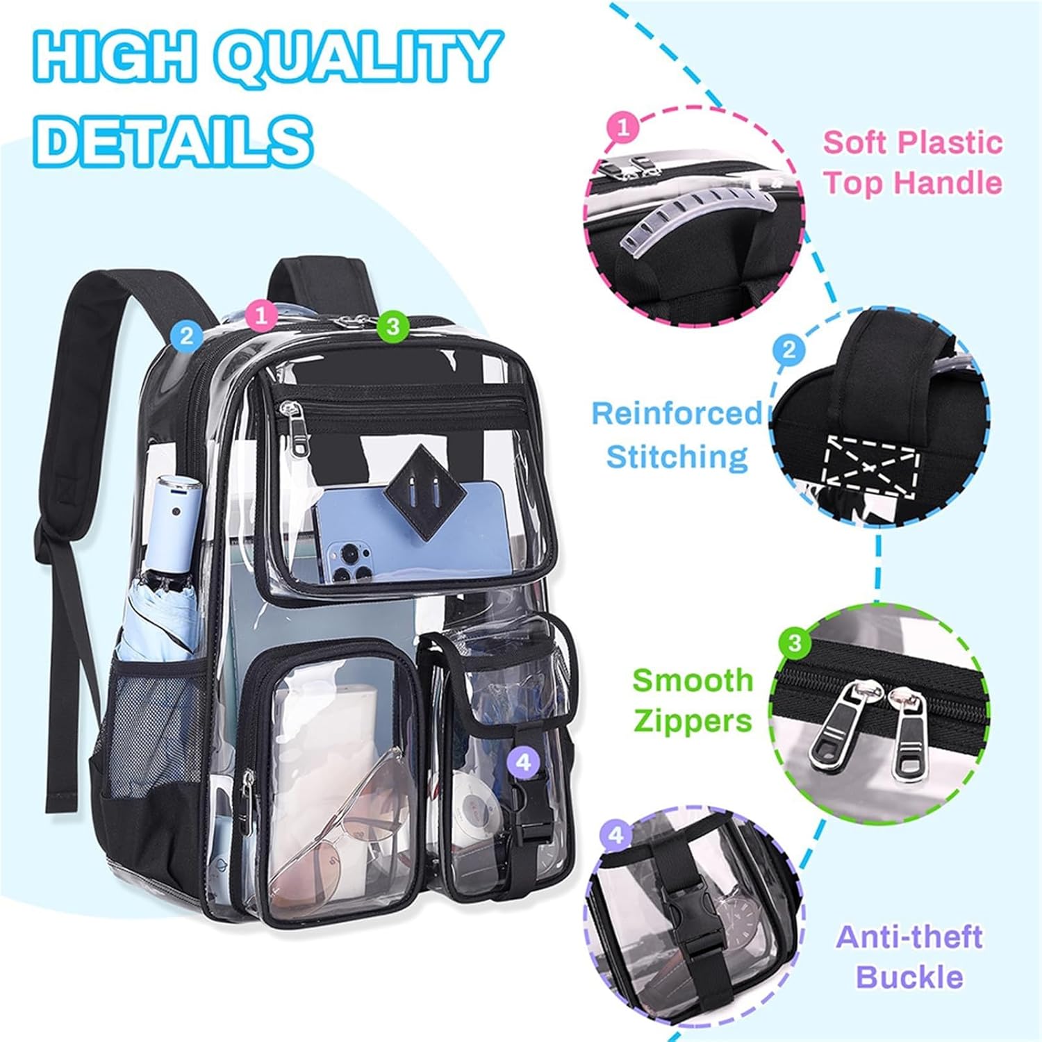 Reinforced stitching, thickened bottom design, and sturdy strap webbing enhance load-bearing capacity and shape retention, suitable for frequent daily use. The smooth surface is easy to wipe clean with a damp cloth or sanitizing wipe.Designed with ergonomic carrying options for all-day comfort. Backpack models feature thickened padded adjustable shoulder straps that evenly distribute weight to reduce shoulder and back strain. This clear bag is ideal for multiple occasions requiring transparent bag policies.Functional Pockets:Dimension: 11.8"H x 3.9"W x 15.35"L;Main compartment with laptop sleeve fit 15.6inch laptop and A4 holders; The front pockets( 1*upper pocket and 2*small pocket), the see through bookbag could packing all your daily essentials.Style : ClassicPattern Type : SolidMain Material : PVCGender : UnisexItem Type : BackpacksClosure Type : Zipper