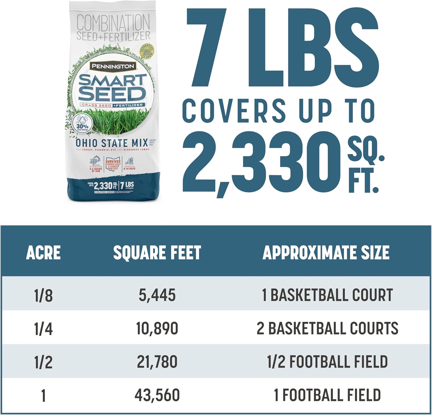 In Ohio, your lawn must withstand cold winters and hot, humid summers. Pennington Smart Seed Ohio Mix consists of a premium mix of Tall Fescue, Perennial Ryegrass and Kentucky Bluegrass that are specifically designed to flourish in this climate. Smart Seed Ohio grass seed mix is disease resistant and drought tolerant and contains just the right amount of fertilizer to help your lawn succeed. In areas of your lawn that receive 4 to 6 hours of sun daily, plant this grass seed mix in the early spring or early fall and see results in 8 to 14 days. This 7-pound bag covers up to 2,330 square feet for overseeding an existing lawn and 770 square feet for starting a new lawn from scratch. What makes Smart Seed smart? It’s our innovation. Pennington's NexGen Turf Research is the largest private grass seed research facility in the United States. We lead the industry in developing top-performing, water-conserving, sustainable seed. Once established, our purebred, drought-tolerant Smart Seed grass requires up to 30 percent less water than ordinary grass seed. That's year after year, for the life of your lawn. Plus, our advanced, fertilizer-enhanced seed coat technology speeds establishment and promotes greener grass. Born from Pennington innovation and NexGen breeding and research, Smart Seed brings you better seed, better sustainability and better results.