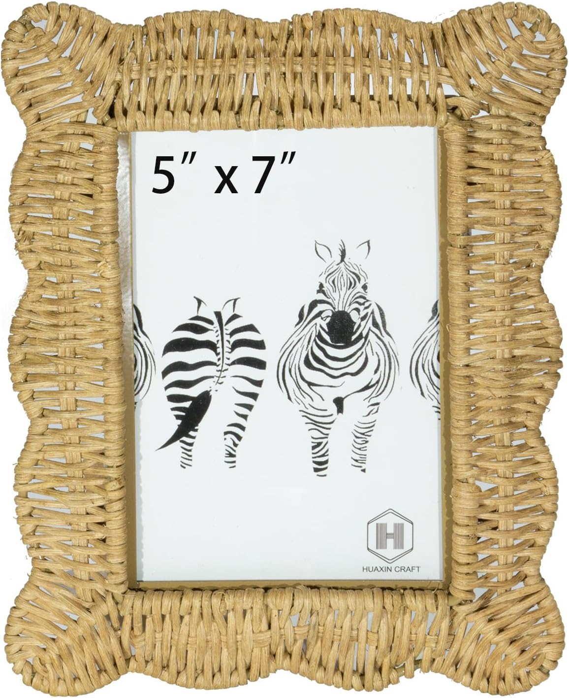 HUAXIN CRAFT H Woven Wicker Picture Frame, 5 x 7 inches with Zebra Design, Rattan Photo Frame with Bohe Style for Tabletop Display Elevate your home decor with this exquisite Bohemian Style Woven Rattan Core Photo Frame. Handmade with intricate details and a bohemian aesthetic, this 4x6 inches frame is a perfect addition to any room. Made of iron and wrapped with natural rattan core, this frame exudes a handmade charm that showcases its unique value. The scalloped edge design adds an elegant touch, while the versatile sizing allows you to display a variety of 4x6 inch photos. Whether placed on a tabletop or shelf, this photo frame will bring a touch of bohemian flair to your living space, making it a must-have decor piece for bohemian enthusiasts and vintage lovers alike.
